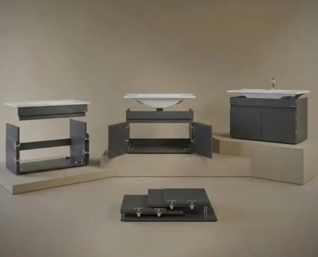 Pratik ve şıkFlexio Katlanabilir Lavabo Dolabı Seti, modern banyolar için tasarlandı.Melamin kaplamasıve özel kilitleme noktalarıyla defalarca kurulup sökülebilir;ekipman gerektirmez. Sökme-takma sırasında deformasyon veya rijitlik kaybı olmaz, fuar alanları, taşınmalar veya konsept değişikliklerinde kolayca kullanabilirsiniz.