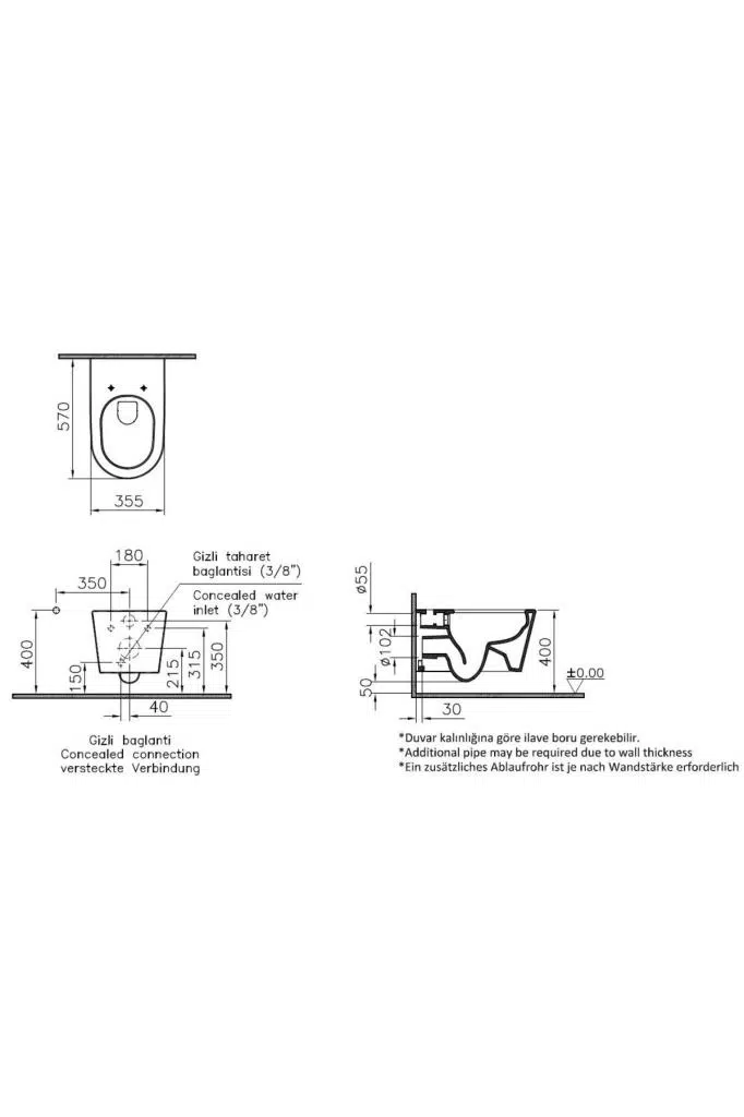Taharet borusu girişi sıva altı uygulamalı VitrA – Artema yetkili servisleri haricindeki kişiler tarafından yapılan hatalı montaj, bakım, onarım ve demontaj nedeniyle üründe oluşan arıza ve hatalar, garanti kapsamı dışında kalmaktadır