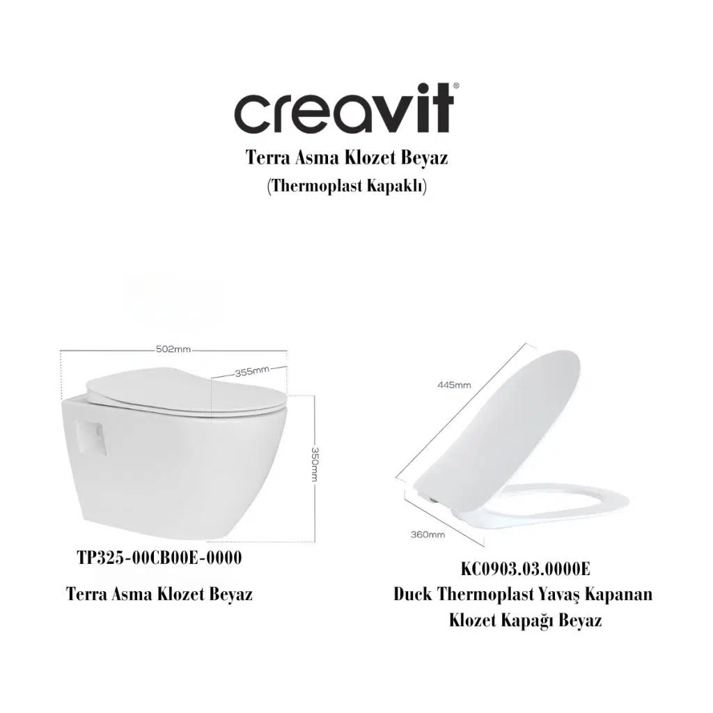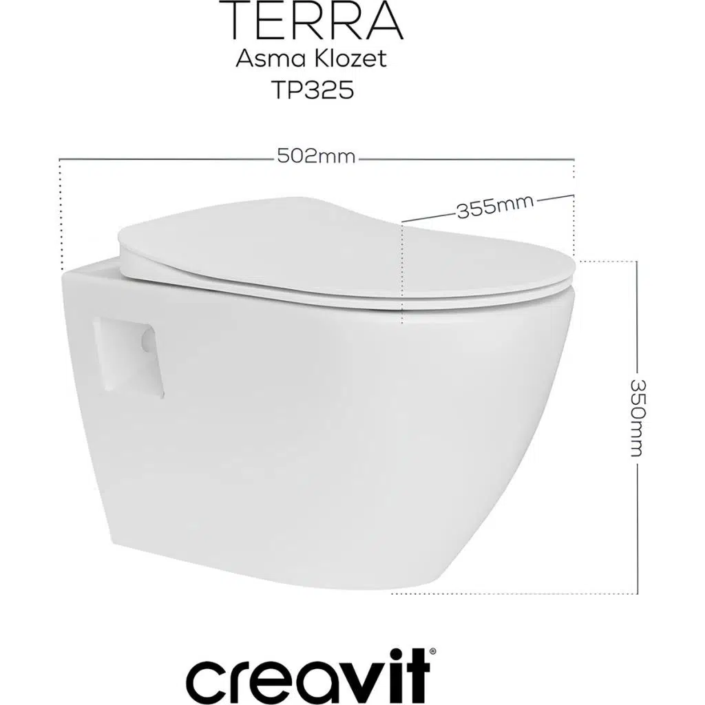 Creavit TP325 Terra Asma Klozet + Creavit Yavaş Kapanır Kapak Ürünler Klozet ve yavaş kapanır kapaktan oluşmaktadır. Kalite kontrolleri yapılmış seramik klozet ve termoplast kapak. Ürünlerin paketlemeleri kırılmalara karşı dayanıklı olacak şekilde yapılmaktadır.