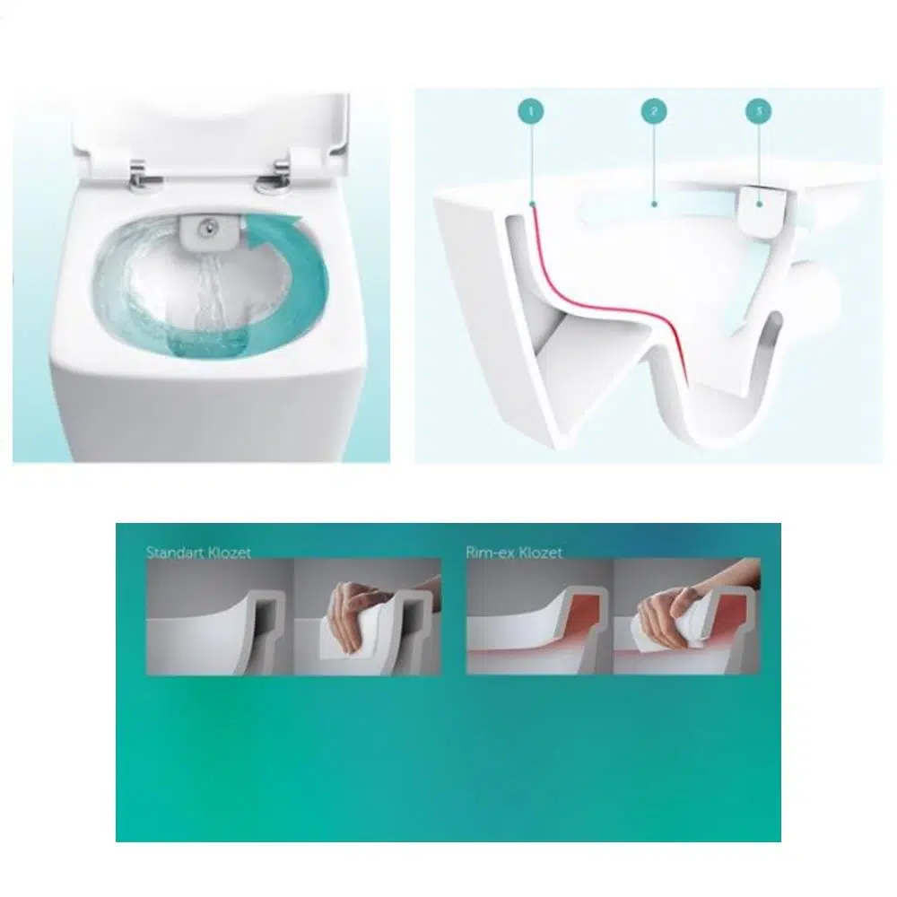 Rim-ex: Yenilikçi Rim-ex, kanalsız iç hazne tasarımıyla kolay temizlenir, çok daha az kir tutar ve maksimum hijyen sunar.